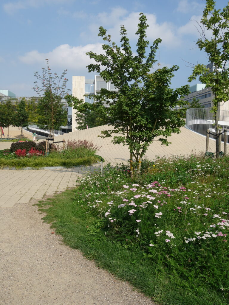 Karen Blixen Plads med grönskande rundlar och cykelställ under konstgjorda kullar.
