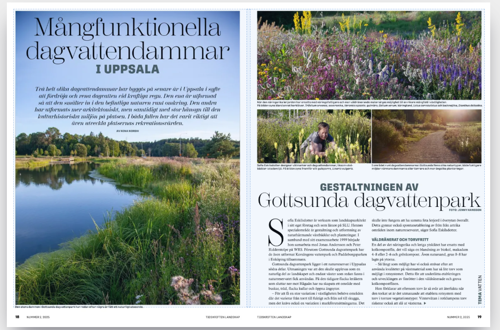 Jag skriver då och då artiklar för Tidskriften Landskap, en branschtidning med fokus på utformningen av parker, torg och andra offentliga miljöer. I ett av mina reportage har jag lyft fram hur dagvattenhantering både kan vara ett designelement i stadens utemiljö och en möjlighet att värna om biologisk mångfald och skyddad natur: